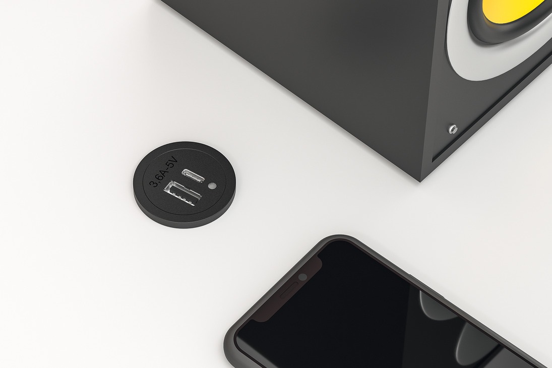 Nabíjecí jednotka se zabuduje do desky stolu a pod.