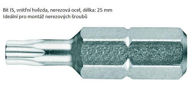 Bit IS, délka 25 mm, (IS = innenstern, vnitřní hvězda) Materiál: nerez Použití: vhodné pro montáž nerezových šroubů