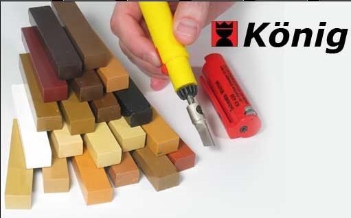 Barevný voskový tavný tmel pro trvalou opravu poškozených ploch, jednotlivé odstíny lze navzájem míchat. Vlivem zobrazení monitoru se mohou odstíny mírně lišit od originálu, před aplikací si proto vzorky porovnejte s požadovaným odstínem. Značkový velmi kvalitní výrobek německé firmy König