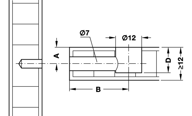 Materiál: zinkový odlitek Pro průměr pouzdra: 12 nebo 13 mm Vrtání pro táhlo: průměr 7 nebo 8 mm, podle použitého spojovacího táhla Vzdálenost B: vzdálenost od středu pouzdra Minifix ke hraně police ( 24 nebo 34 mm ) v závislosti na volbě délky táhla Použitelné pro všechny spojovací táhla systému Minifix.