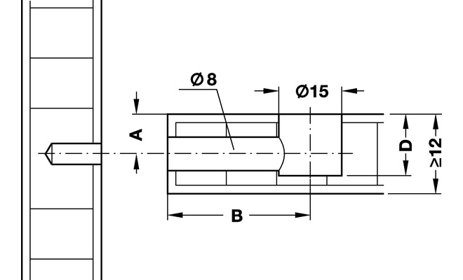 Materiál: zinkový odlitek Pro průměr pouzdra: 15 mm Vrtání pro pouzdro:průměr 7 nebo 8 mm podle použitého spojovacího táhla Vzdálenost B: Vzdálenost od středu pouzdra Minifix ke hraně police (24 nebo34mm) v závislosti na volbě délky táhla. Použitelné pro všechny spojovací táhla systému Häfele Minifix