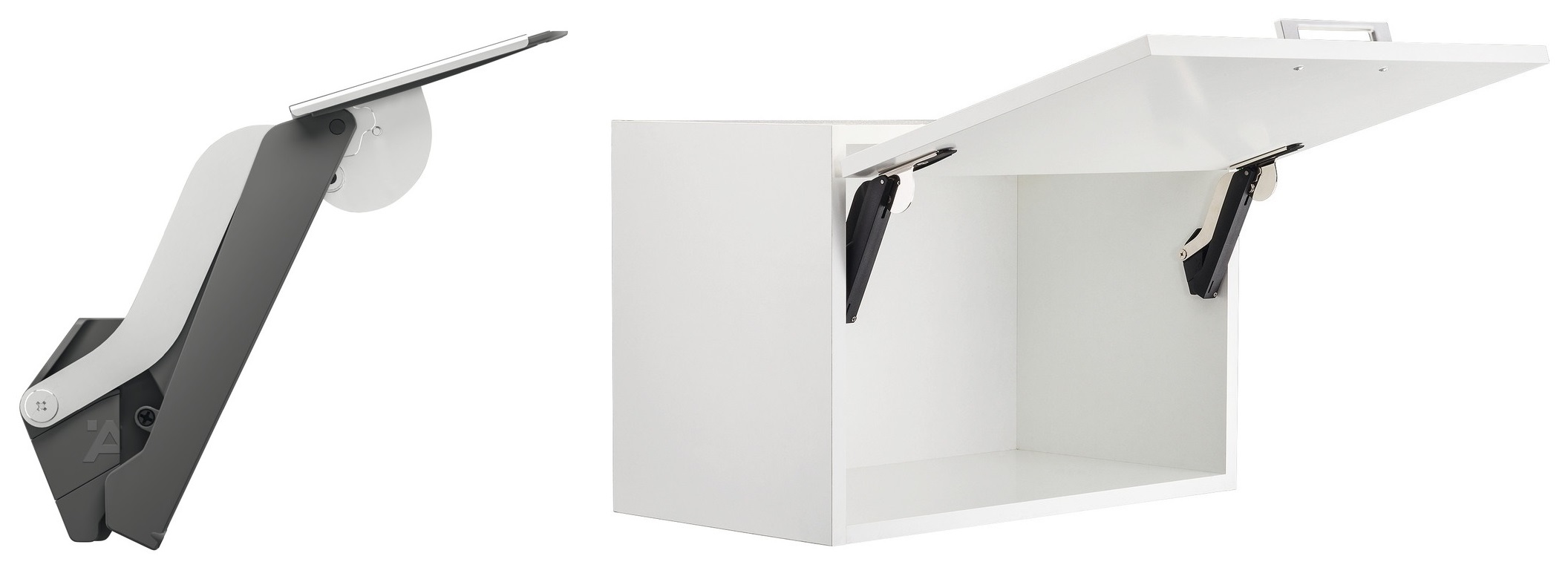 Bílé výklopné kování Häfele Free Space 1.8 push pro dvířka bez úchytek. Otevírá se potlačením na plochu dvířek
