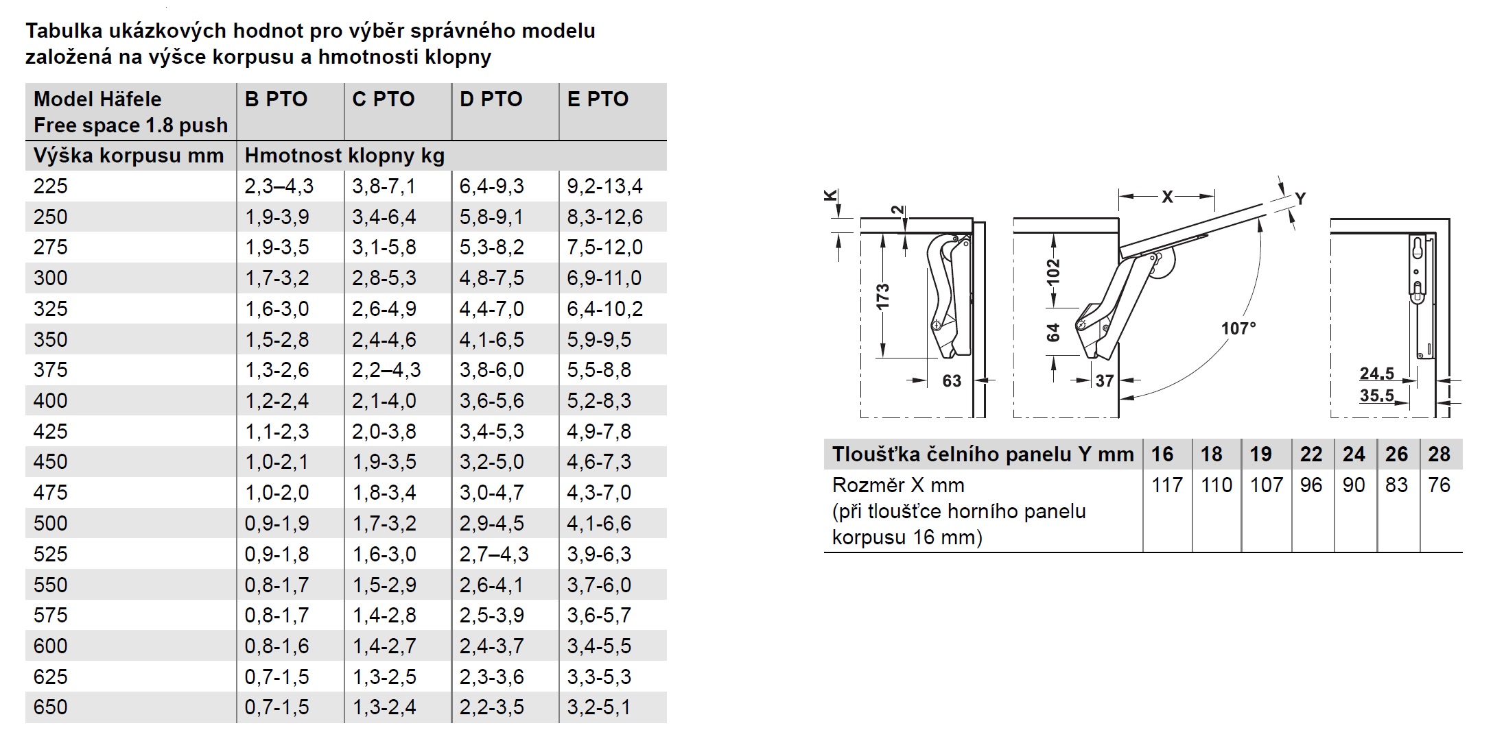 Pro standardní aplikace s výškou čela dvířek od 225mm do 650 mm. K výběru jsou 4 různé varianty (modely) s různou silou pružiny a tlumení. Odpovídající variantu si vyberte v tabulce na obrázku podle výšky a hmotnosti dvířek. Pokud Vám podle tabulky vyhovují dva modely, doporučujeme zvolit ten silnější.