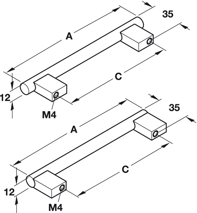 A = délka, B = výška 35 mm, C = rozteč, viz obrázek