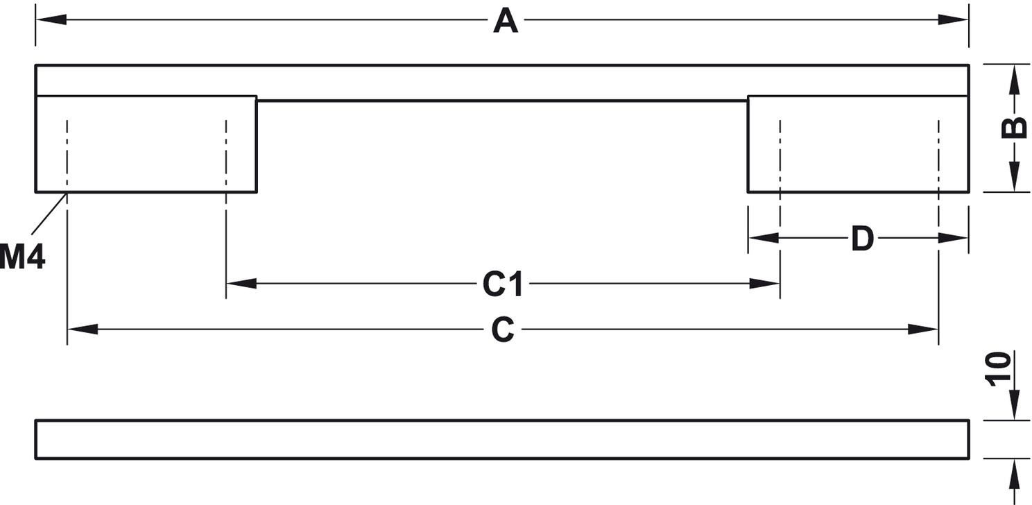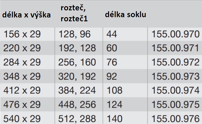 A = délka, B = výška 29 mm, C = rozteč, C1 = rozteč1, D = délka soklu, viz obrázek a tabulka velikostí