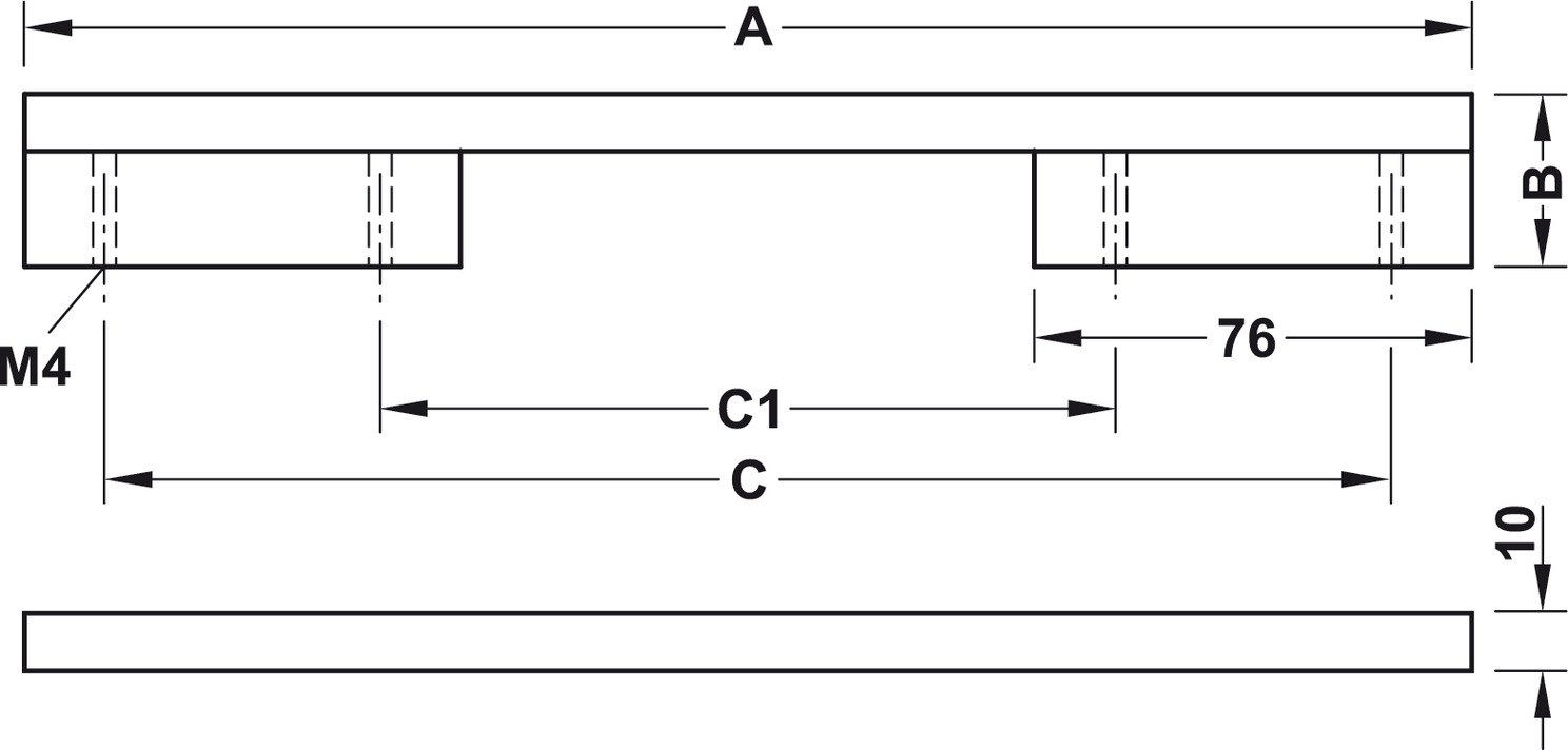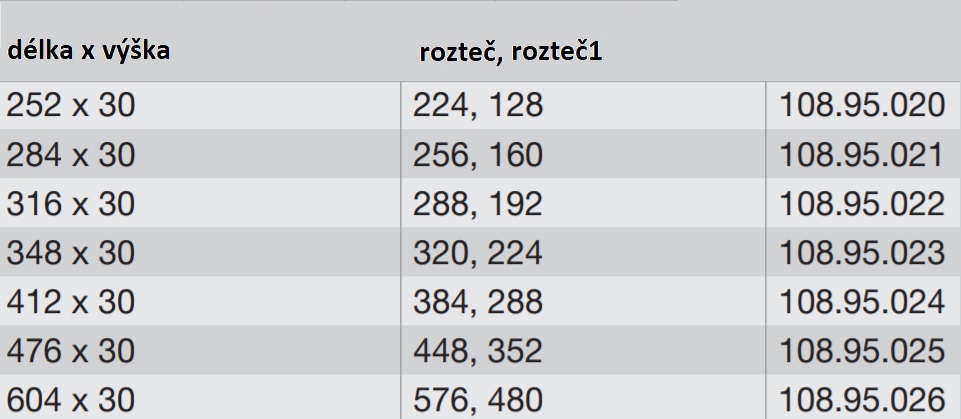A = délka, B = výška 30 mm, C = rozteč, C1 = rozteč1, viz obrázek a tabulka velikostí
