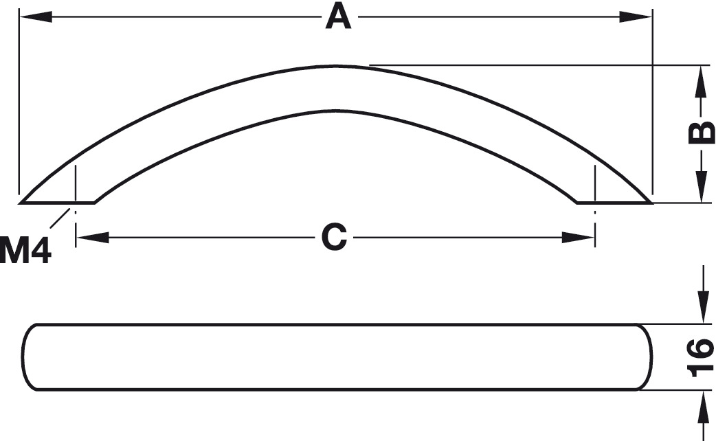 K dispozici v jedné barvě: stříbrná eloxovaná Ve třech velikostech: A = délka, B = výška, C = rozteč, viz obrázek   délka 151 mm, výška 34 mm, rozteč 128 mm délka 188 mm, výška 34 mm, rozteč 160 mm délka 262 mm, výška 34 mm, rozteč 224 mm |    |  |