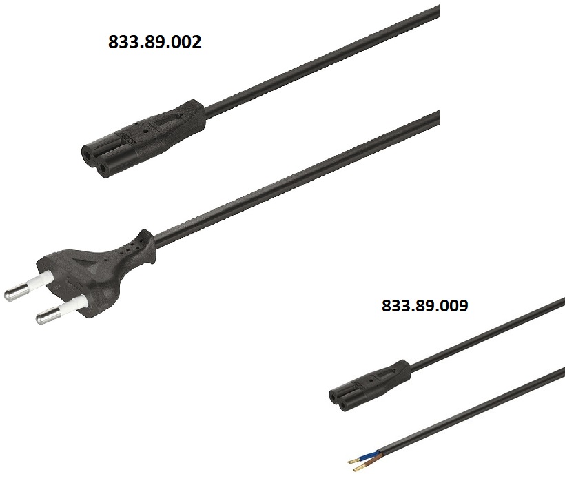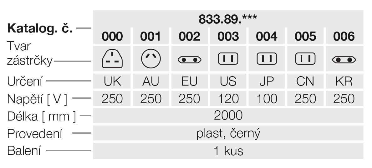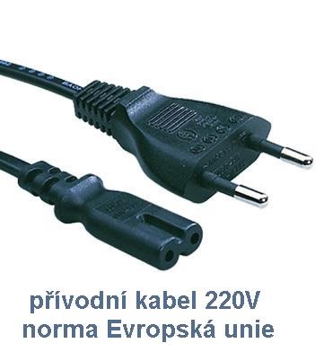 Přívodní kabely na 230V podle české normy, použitelné v EU (mimo Anglie a Spojeného království). Provedení v černém plastu. Délka 2m.