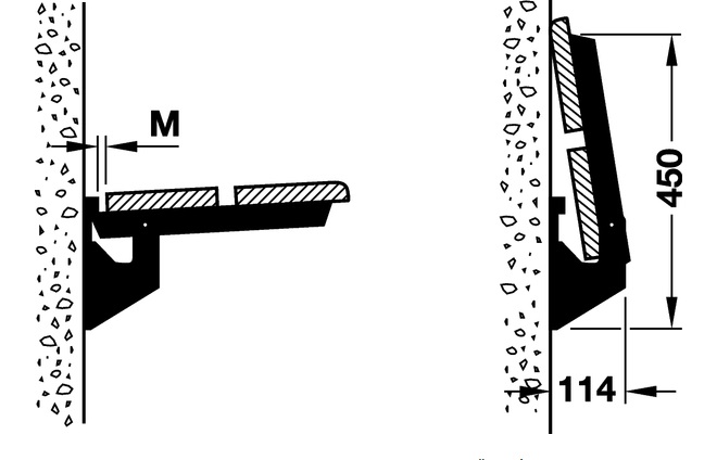 Výklopné konzole pro lavice, nosnost 500 kg/pár Häfele Uvedené nosnosti jsou platné za předpokladu: zátěž je rovnoměrně rozložena konzole jsou správně a spolehlivě připevněny ke stěně Materiál: ocel Provedení: se sklopnou pružinou nebo bez ní Pro zajištění funkce si při montáži všiměte rozměru M minimální hodnota rozměru M: 17 mm tloušťka sedáku: 30 mm spojovací rozměr nosného ramene: 380 mm
