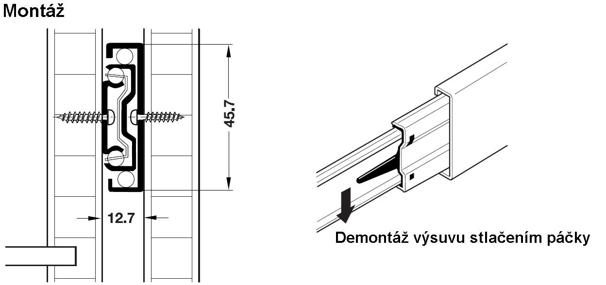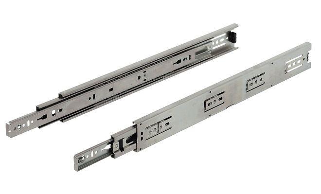 Značkový zásuvkový a policový plnovýsuv Accuride 3832 , zinkovaný, s aretací v uzavřené poloze, bez tlumení.