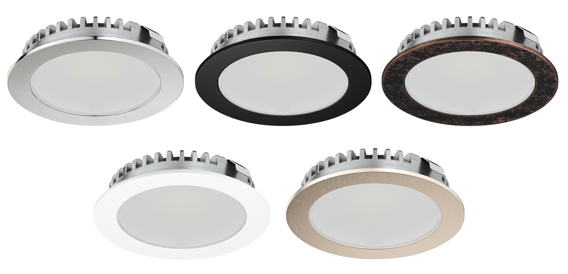Stropní svítidlo pro zápustnou montáž (s použitím kroužků taky povrchová montáž), Häfele Loox5 LED 2094, 12 V, vrtaný otvor Ø 58 mm, materiál hliník, svítidlo s velkou plochou emitující homogenní světlo