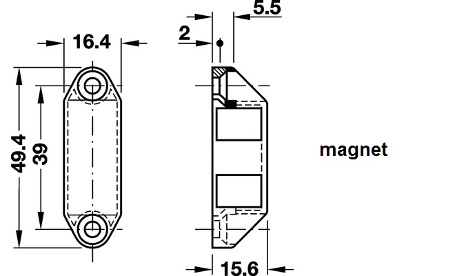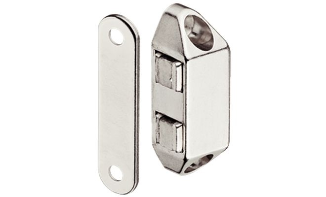 Nábytkový niklovaný nebo chromovaný magnet se silou 6 kg.Materiál: pouzdro zinkový odlitek, protiplech ocel