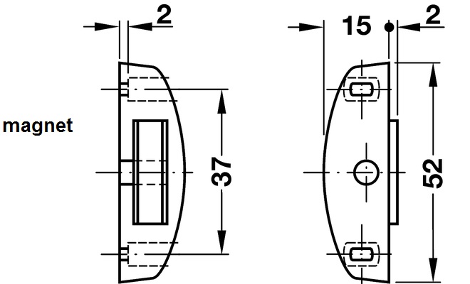 Nábytkový niklovaný magnet se silou 4 kg. Materiál: pouzdro zinkový odlitek, protiplech ocel Montáž pouzdra i protikusu přišroubováním