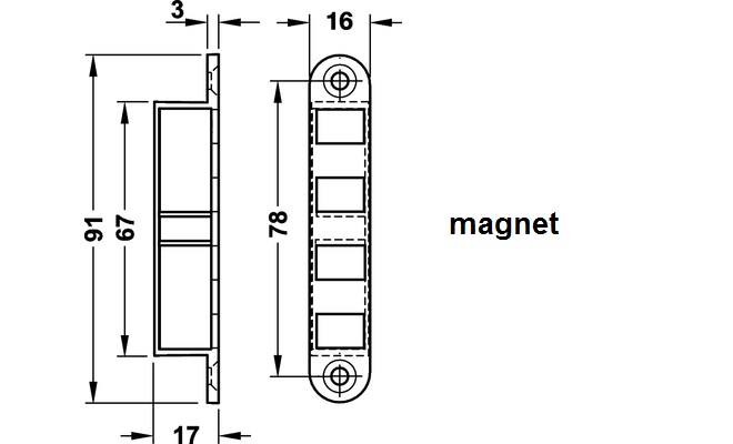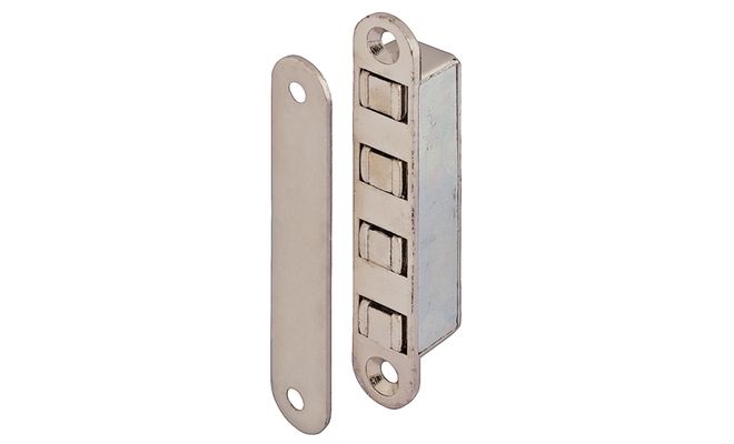 Nábytkový magnet pro zapuštěnou montáž, niklovaný, přídržná síla 8 kg. Materiál: zinkový odlitek, protikus ocelový Montáž zapuštěním a přišroubováním.