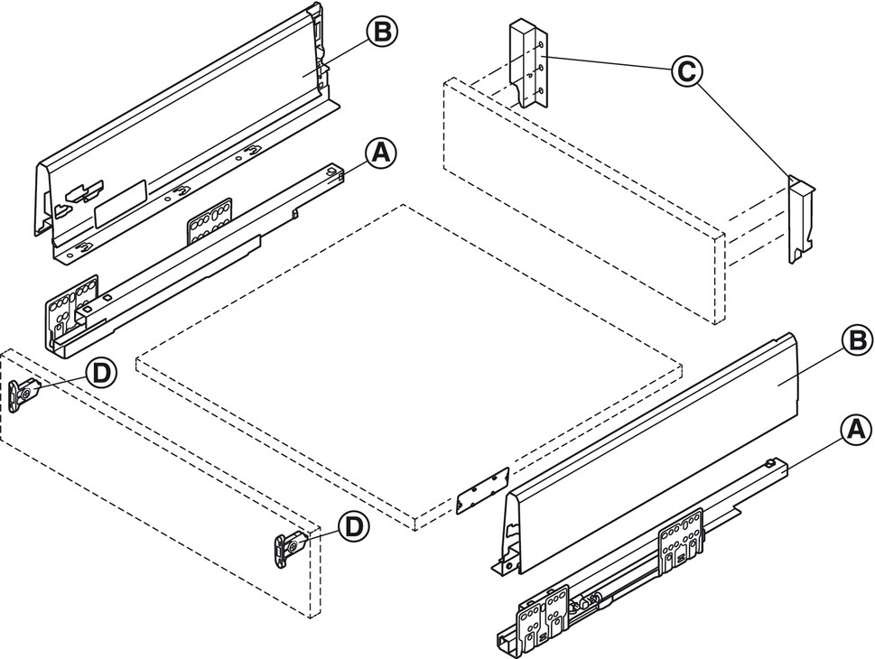1x levá a 1x pravá dvojstěnná bočnice zásuvky