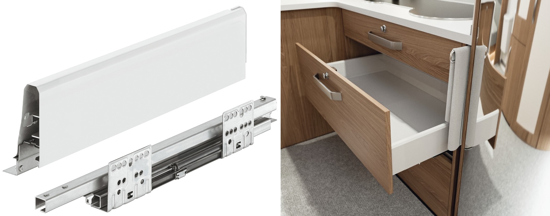 Plnovýsuvný zásuvkový systém Häfele Matrix Box S v bílé barvě.