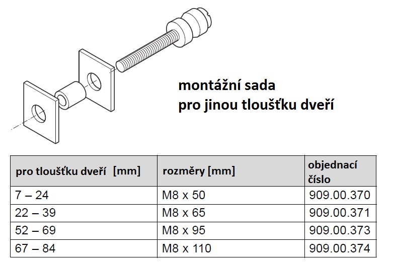 | 909.00.374 | - montážní sada, síla dveří 67 - 84 mm | 1komplet | 4 dny | 186,75 Kč |