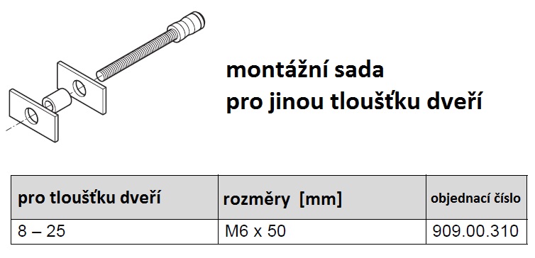 | 909.00.310 | - montážní sada, síla dveří 8 - 25 mm | 1komplet | 4 dny | 98,32 Kč |