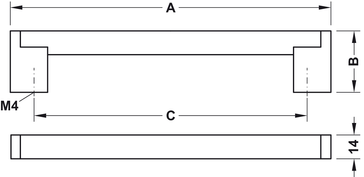 A = délka, B = výška, C = rozteč, viz obrázek.