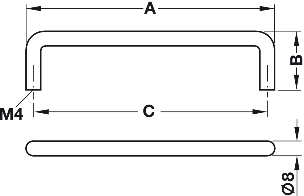 Nerezová hrazdová úchytka, jakost materiálu 1.4305 Matně broušená K dispozici v několika velikostech: A = délka, B = výška, C = rozteč, viz obrázek. Velikosti udávány v mm. |    |  |