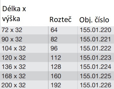 | 155.01.220 | délka 72 mm | 1ks | 4 dny | 59,38 Kč |  |  | 155.01.221 | délka 90 mm | 1ks | 4 dny | 66,24 Kč |  |  | 155.01.222 | délka 104 mm | 1ks | 4 dny | 67,39 Kč |  |  | 155.01.223 | délka 120 mm | 1ks | 4 dny | 74,24 Kč |  |  | 155.01.224 | délka 136 mm | 1ks | 4 dny | 77,66 Kč |  |  | 155.01.225 | délka 168 mm | 1ks | 4 dny | 89,08 Kč |  |  | 155.01.226 | délka 200 mm | 1ks | 4 dny | 99,35 Kč |  |  |