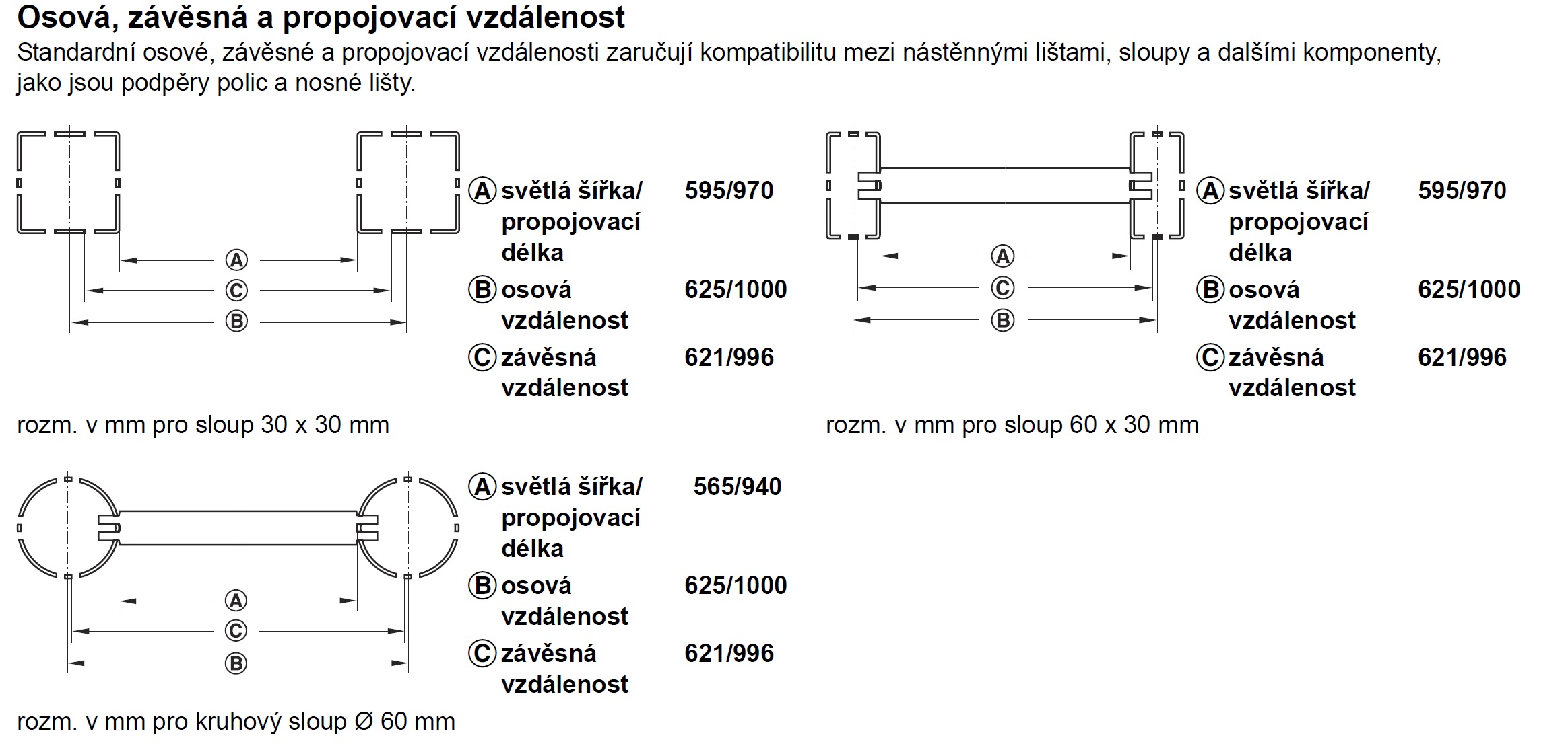 Doporučená osová, závěsná a propojovací vzdálenost pro jednotlivé typy sloupů je uvedena na obrázku. Standardní osové, závěsné a propojovací vzdálenosti zaručují kompatibilitu mezi nástěnnými lištami, sloupy a dalšími komponenty, jako jsou podpěry polic a nosné lišty.