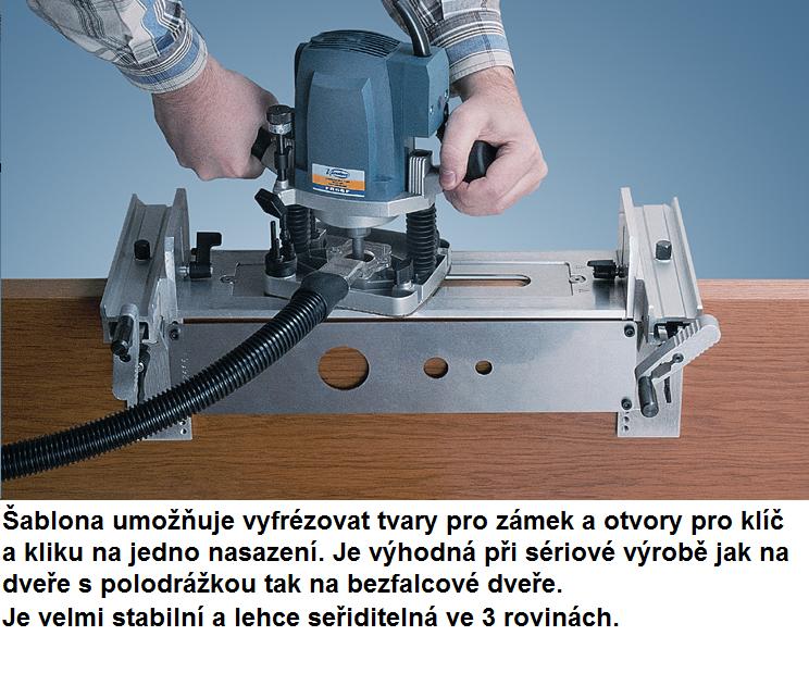 Šablona je konstruována pro provádění čelních a postraních otvorů ve dřevě pro jakýkoliv typ zámků na dveře a protiplechů na dveřních rámech. Šablonu s výhodou použijete pro horní frézku Virutex FR66P, ale lze ji použít i pro jiné typy frézek. Lze ji použít nejen při výrobě ve vašem provozu, ale také na montážích lze frézovat již zavěšené dveře bez poškození povrchu díky bezpečnému a spolehlivému sevření. Při horizontální práci je možno použít tyč která je v příslušenství a umožní Vám nastavení šablony vždy ve stejné výšce od konce dveří.