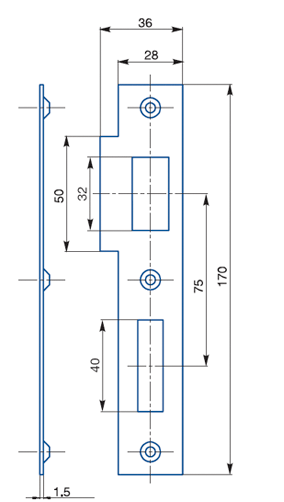 zapadací plech rovný - pro zámek s roztečí 72mm, levý nebo pravý