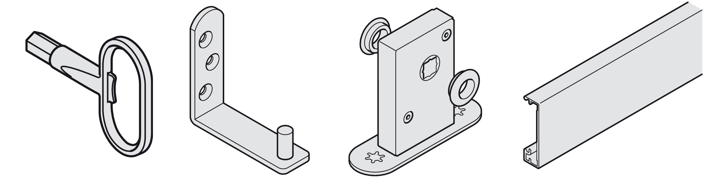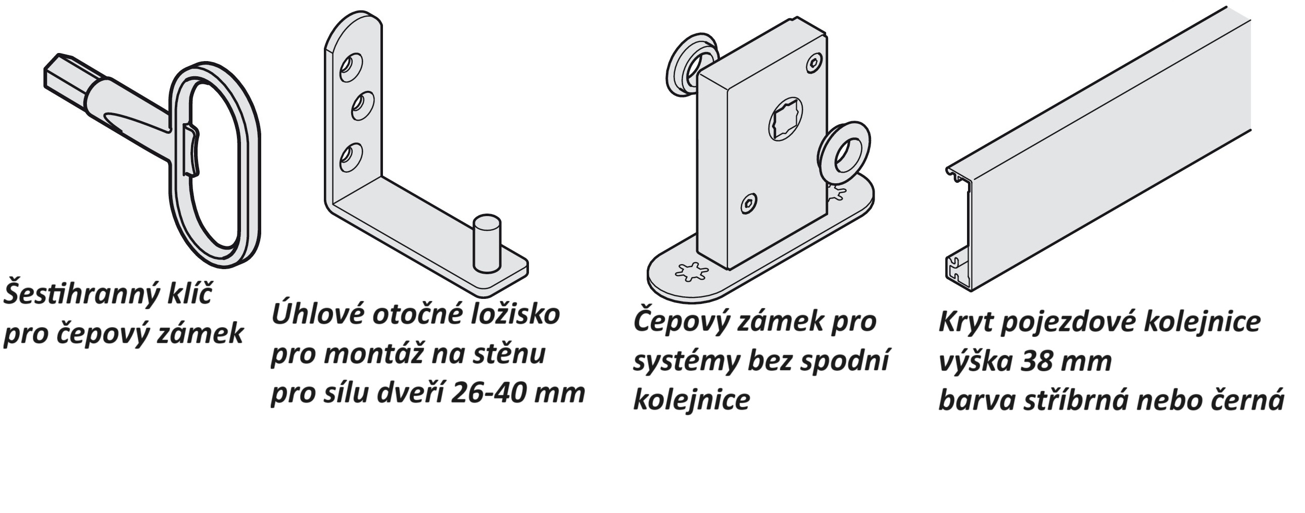 - kryt kolejnice ve stříbrné nebo černé barvě se nasazuje na kolejnici ve které jezdí kolečka kování. Je to designový prvek. Je stejný také pro posuvné kování. Kryty proto naleznete ZDE - úhlové černé ložisko je náhrada za stříbrné ložisko které je součástí základní sady kování. - čepový zámek a šestihraný klíč slouží jako zámek zavřených dveří, kdy čep zajíždí do podlahy a zabraňuje otevření dveří. - silikonovým těsněním ve třech barvách (bílá, béžová, černá) můžete utěsnit mezery mezi křídly. - magnety pro vyrovnání dveří se frézují do svislé hrany dveří a velmi je doporučujeme. Používají se hlavně u plochých nerezových závěsů. Použijete-li 2 závěsy, použijte 1 magnet. Použijete-i 3 závěsy, použijte 2 magnety.