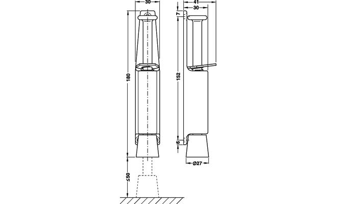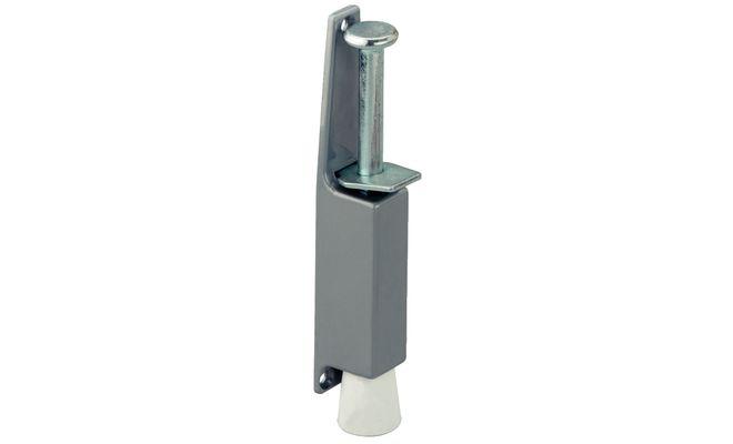Dveřní stavěč pro upevnění dveří v jakémkoliv úhlu. Materiál: Pouzdro ze zinkového odlitku, čep ocelový, zátka gumová Povrchová úprava lakováním, čep pozinkovaný, zátka bílá Pro hmotnost dveří do 40 kg Zdvih čepu 50 mm