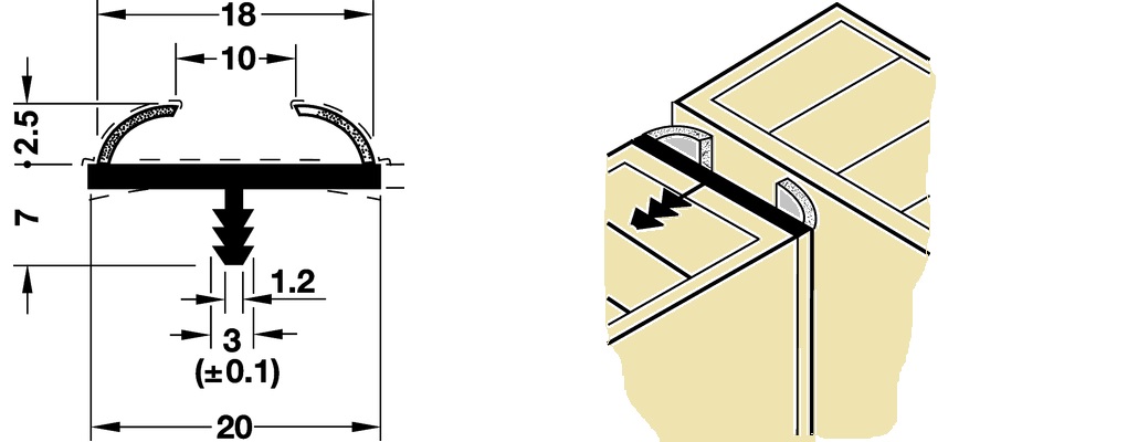 Těsnící nábytkový profil zabraňuje pronikání vlhkosti kolem bočních soklových hran.