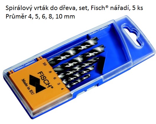 Sada 5 spirálových vrtáků do dřeva Použití: všechny druhy dřeva, MDF a akrylového skla Materiál: HSS Průměr: 4, 5, 6, 8, 10 mm Provedeni: s centrovanou špičkou