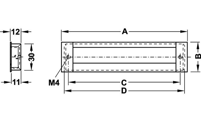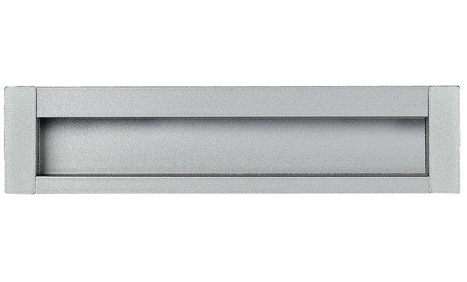 Zápustná úchytka v barvě hliníku. Koncovky hliníkové, prostřední část zinkový odlitek. Montáž přišroubováním zezadu dvěma šrouby M4.