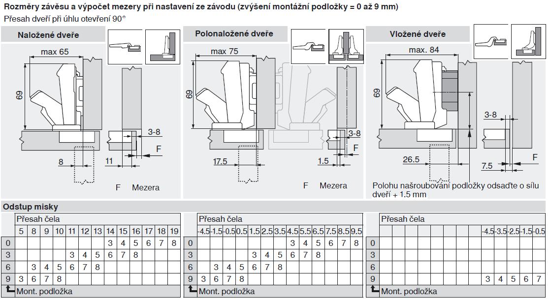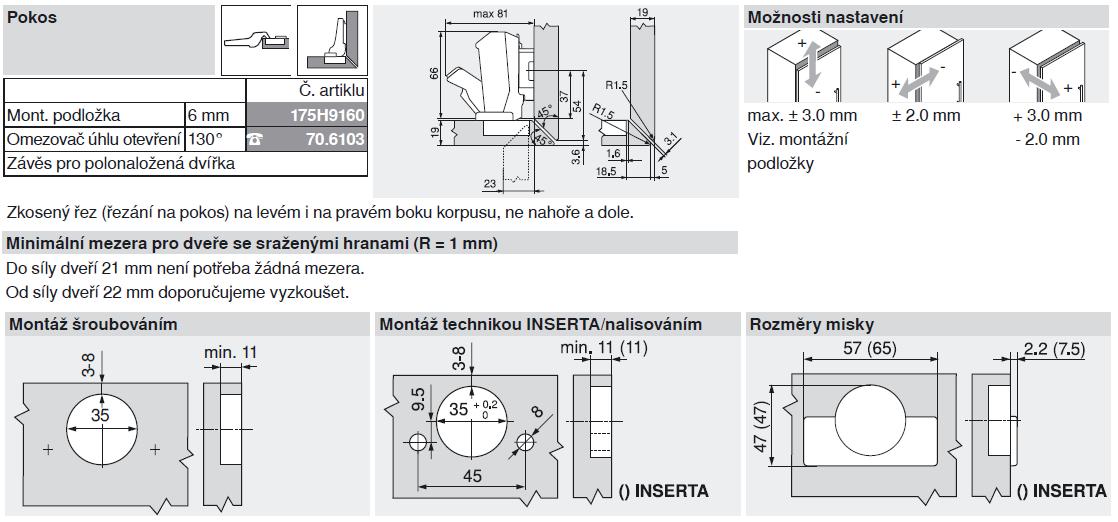- Celokovový závěs, poniklovaný - Úhel otevření 170° - S komfortním nastavením hloubky šnekovým závitem - S zavírací mechanikou (pružina) - Montáž a demontáž dvířek na korpusu bez nářadí - Nastavitelnost ve třech směrech (s odpovídající montážní podložkou) - U techniky INSERTA navíc montáž misky bez nářadí
