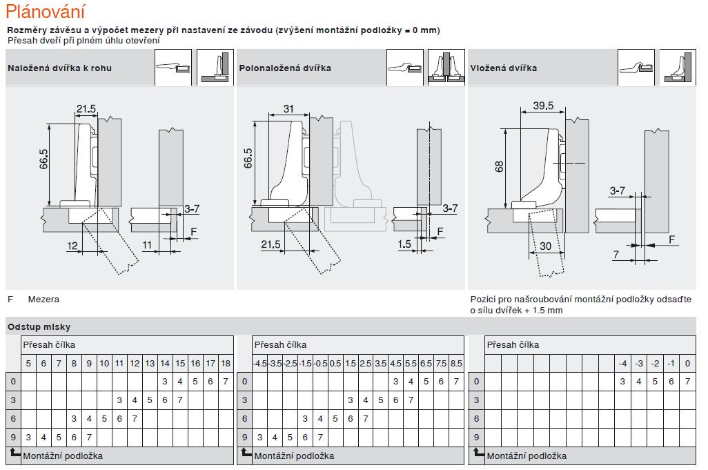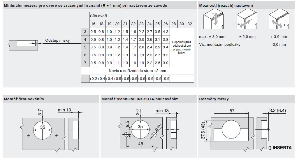 - Celokovový závěs, poniklovaný - Úhel otevření 110° - S integrovaným BLUMOTION - S deaktivací BLUMOTION - S komfortním nastavením hloubky s pomocí šnekového závitu - Kompatibilní se stávajícími montážními podložkami - Se zavírací mechanikou (pružina) - Montáž a demontáž dvířek na korpusu bez nářadí - Nastavitelnost ve třech směrech (s odpovídající montážní podložkou) - U techniky INSERTA (rozepřením) navíc montáž misky bez nářadí